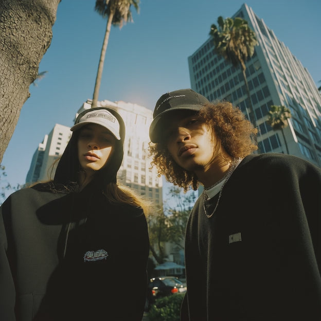 90s polaroid-style editorial fashion photo in the Hollywood Hills, shot on a 50mm lens, male models riding sleek electric dirt bikes along dusty trails overlooking Los Angeles skyline, wearing minimalist...